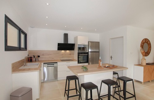 Are you dreaming of a Provencal vacation home with everything your heart desires? Here you will find an idyllic oasis on the edge of the old feudal village, Chateauneuf de Mazenc. This modern and comfortable vacation home is located in the Drôme Provençale and surrounded by rolling Provençal hills. The spacious accommodation is practically and stylishly furnished and offers everything you need for a wonderful vacation. In the bedrooms there is more than enough space for a large family or two families of friends. On the south side of the cottage is a large covered terrace that leads to the cozy and comfortable living room and large fitted kitchen with dining area. The green, fenced garden with enticing private pool invites you to pure relaxation. Have a coffee on the sunny terrace and plan the next days excursions. After a long day, enjoy a delicious outdoor barbecue and end the evening relaxing on the sofa with a glass of wine and a good movie.