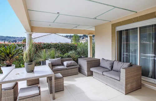 Welcome to this inviting house that offers ideal conditions for a fantastic vacation with family or friends. This Provençal style villa is close to all stores and in a very quiet residential area. The ambience of the house is bright and modern and offers many amenities. The sober and neat decoration with quality furniture provides the ideal setting for your relaxing getaway. The American kitchen, which opens onto a shaded climatic pergola, will be your privileged place for all your outdoor meals. One of the highlights of the house is the refreshing private outdoor pool, where you can swim undisturbed and then relax on the large south-facing terrace in a fenced garden with olive trees and palm trees.