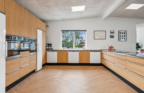 Welcome to this unique holiday home in Rødding, a former school that has been completely renovated and now combines modern comfort with historic charm. This spacious house offers plenty of room for large families or several families who want to holiday together. The stylishly furnished interiors exude a cosy atmosphere and invite you to linger. The large activity room and the in-house gym/ball sports hall, which can be used free of charge, offer countless opportunities for sport and fun. You can also enjoy the swimming pool with slide and panoramic views of the Limfjord.