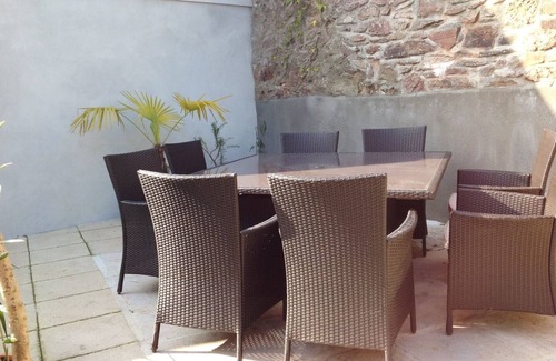 In Kingsand, opposite the beach, a handsome, Grade II listed, Georgian house on three levels with splendid out-to-sea views. A lovely, spacious home, with its quirky origins cleverly dovetailed with 21st cent. comfort. It sleeps 9 in four bedrooms, three double, one en suite and a twin. Living room with wood-burning stove, and sea view; generous kitchen with dining table and chairs glazed doors to courtyard and, at the far end, a comfy sofa, and door to utility shed. Under-stairs WC. Two family bathrooms. A secure courtyard on two levels with steps up to a patio with garden furniture, back gate to a private footway. A gorgeous house beside the beach and within strolling distance of the village pubs and shops.