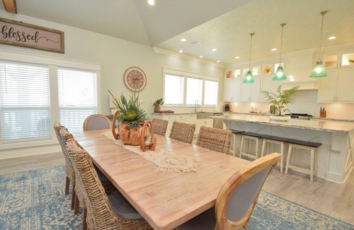 You enter into a massive open concept living area. The living room is fabulously decorated with comfort in mind. It has a lounging zone for the television watching or video game playing with a separate seating area for those who prefer to visit or play board games. There is ample space for your large group to relax and be entertained after a day enjoying the beach and pool. Pictures can't do this home justice, we look forward to welcoming your family for an amazing get away .