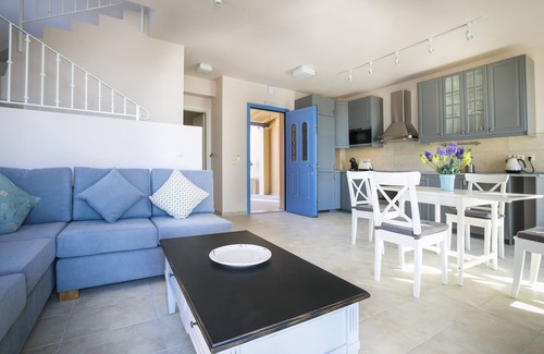 This Villa has two floors All rooms are beautifully furnished to the highest standards.Downstairs has a open plan fully equipped kitchen- dining -living area opening on to a large terrace which overlooks the citrus garden and has amazing sea views. From here we can walk down to the pool through the garden .Also on this floor is twin or double bedroom according to guest wishes and a bathroom with shower.