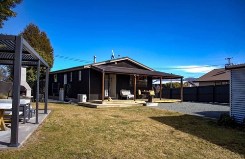 No3 on Fraser, Entire House in Twizel, New Zealand. The perfect 3-bedroomholiday home, 1 1/2 bathrooms, Central location in the town circle. Where modern comfort meets Mackenzie Country charm. Wraparound decking frames views of the Ben Ohau Range, while open-plan living keeps everyone connected—chat at the breakfast bar, unwind in the lounge, or enjoy movie nights on the Smart TV. Step outside to a covered alfresco space with cozy fire and pizza oven.