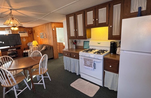 Inside the cabin...The property features a living room with a large television and a fully furnished kitchen and dinette. Enjoy your morning coffee in the sunroom, where you can open all the windows to let in the cool breeze from the lake. The bathroom has a stand-up shower. The first bedroom has a queen bed and a TV, while the second bedroom has two twin "trundle" beds and a TV. Amenities include WiFi, board games, all linens (excluding beach towels), and starter coffee supplies.