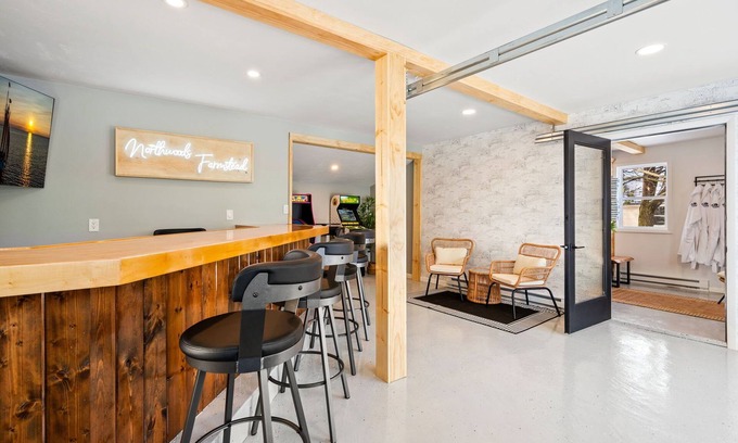 One of the most unique features of Northwoods Farmstead is the Entertainment Barn, a separate building from the main house designed for fun and relaxation. Inside, you’ll find an indoor bar with a mini-fridge, a 65-inch smart TV with YouTube TV provided makes this space great for catching the big game, and arcade games of Golden Tee and Ms. Pac-Man offer plenty of entertainment.