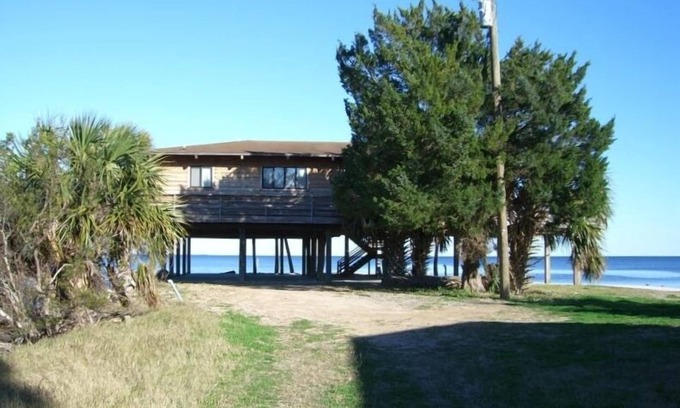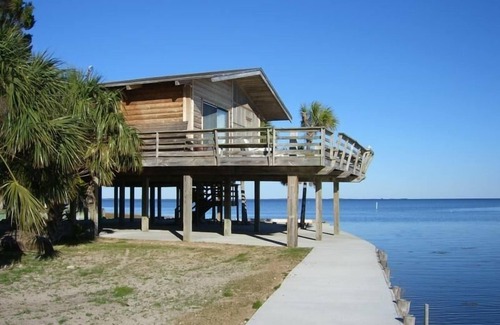 Lovely, comfortable cottage at the end of a point directly on the Gulf of Mexico. Panoramic views of Apalachee Bay - canals on both sides. Area rich in bird and wildlife. Excellent fishing, boating, and sailing area. Very low traffic and flat terrain makes it ideal for walking, hiking, and biking. Boat ramp and public beach at Shell Point, 10 minutes by car. Large screened porch and two decks. Completely furnished and equipped. MB has queen bed. 2nd bedroom has queen bed, and a bunk bed with double bed bottom and twin top bunk. Small private, but unfenced swimming pool on property. 12'x12x4'deep. Pole house, stairs up to living area.