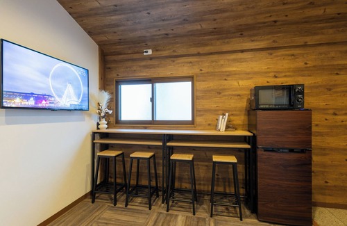 The dining area includes a counter table and a 40-inch TV, with access to Amazon Prime Video, YouTube, and Netflix for your entertainment. The mini-kitchen is well-equipped with a refrigerator, microwave, rice cooker, and more, perfect for those who prefer to cook their own meals. A convenient washing machine is also available. The facility includes a shower room and toilet.