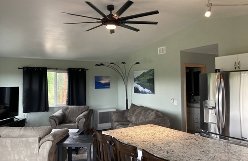 Each bedroom has a ceiling fan for summer days and thermal black-out curtains for those short summer nights. The bathroom has double sinks, a tiled walk-in shower and great water pressure. Body wash, shampoo, conditioner, body lotion and a hair dryer are provided for your convenience. Hand and bath towels are provided and will be changed every three days if your plans including 5 or more days.