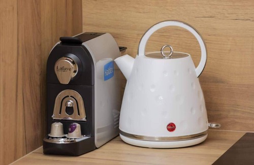 Table with 4 chairs, induction cooktop, hood, refrigerator with freezer, oven with microwave function, electric kettle, coffee maker (for capsules), dishwasher, glasses, set of pots, cutlery, frying pan