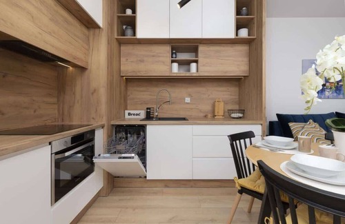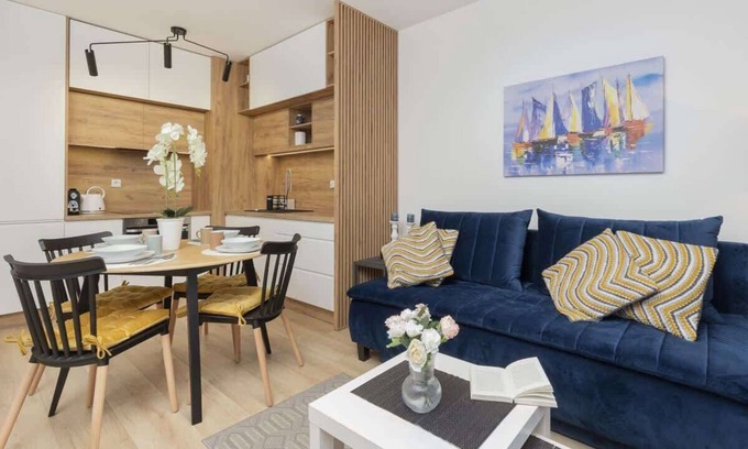 The stylish 38 m² apartment has the capacity to accommodate up to 4 people. It is an ideal choice for a family getaway or for a couple of friends. The apartment space offers a spacious living room with a balcony and kitchenette, a bedroom and a bathroom with a shower and toilet. The living area with an attached balcony, equipped with a comfortable sofa bed, as well as the bedroom with a double bed, provide a perfect place for rest and relaxation. The apartment has many useful amenities, from multimedia and high-speed Wifi access to comprehensive kitchen and bathroom utensils. A complimentary set of toiletries (soap, shampoo and shower gel), towels and linens are provided to help start each stay. Guests traveling by car can take advantage of a parking space in the garage hall. The sublime arrangement of the apartment and high-quality furnishings guarantee a stay at the highest level. Complementing the unique aura of the apartment is an attractive interior color scheme with the use of stylish decorative elements.