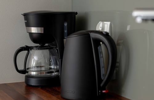 Induction cooktop, steam absorber, dishwasher, electric kettle, drip coffee maker, refrigerator, freezer, set of dishes and utensils.