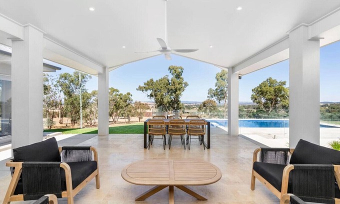 Enjoy some quiet time in a beautiful rural Riverina setting, just 12 minutes from the main street of Wagga. Offering peace, privacy, and picturesque views, this modern country home is surrounded by 30 acres of countryside. It is a luxurious retreat for small or large families and groups of friends. Take a dip in the pool, appreciate the spectacular sunsets, or cosy up by the fireplace at night.
