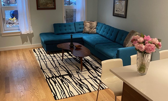 Chic, newly renovated 2 bedroom ground level floor-through apartment one block from the subway and buses. This is a private apartment in a duplex townhouse, with a private entrance. Triple pane south-facing windows look out onto the street and front garden let the light in and keep the noise out. A spacious living room with sleeper sofa and open kitchen/dining area . The rear windows both lookout into the private garden in the backyard.