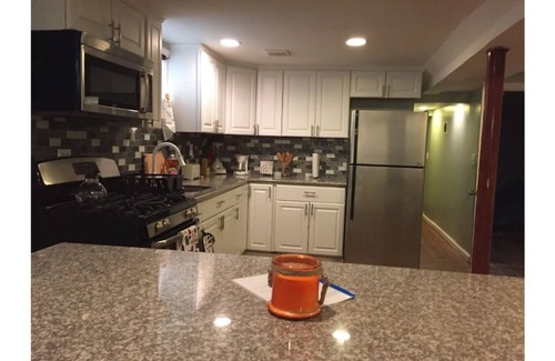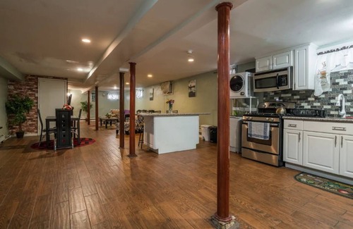 This is a two bedroom road level space that is perfect for people on a small budget. Suitable for college students or a family of 7 on a small budget. It's over 1000 square feet, open and modern. You will be surprise by the space and style for a low price. The house comes with everything you will need and more. it has a modern kitchen and updated bathroom. minutes from Manhattan, time square by train. Just an 8 minutes walk or less to the train station that offers a gateway to see the big apple.