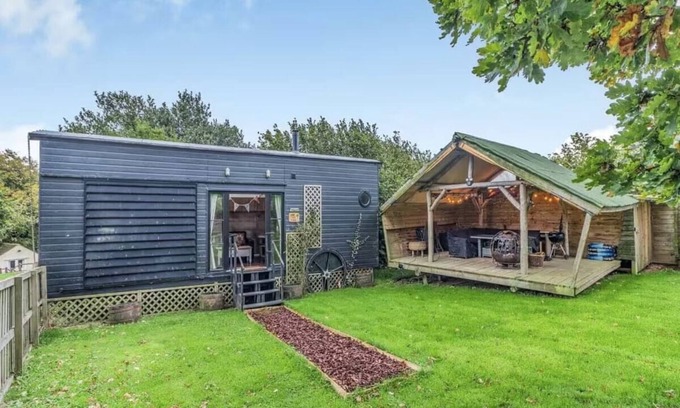 But wait, there's more! Step outside to your private entrance and grounds, complete with a cool wooden lodge for outdoor dining and hanging out. Time to make memories and live your best glamping life at Oak Tree Lodge!