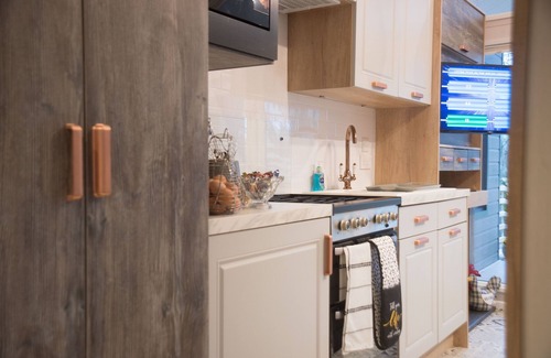 Inside, the open-plan kitchen and living space combines style with practicality. The kitchen is well equipped with sleek light grey cabinetry, copper handles and taps, a tile-effect splashback, and under-cupboard LED lighting. It includes an integrated microwave, fridge with freezer box, two-burner gas hob with extractor fan, and a domestic-style sink—perfect for preparing meals together.