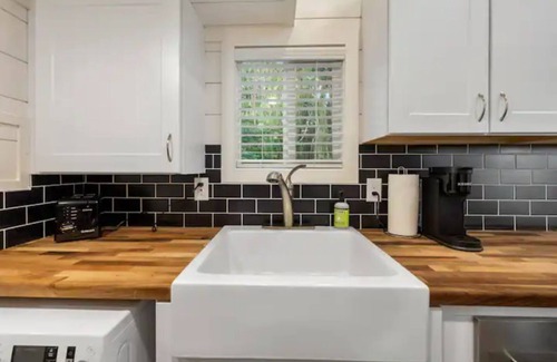 The loft bedroom has a queen bed for two while the built-in dining table/couch converts into a full bed for up to two more guests. The private bathroom features its own sink, water conserving toilet, and full sized shower. Cooks and bakers will appreciate the kitchen complete with a full sized refrigerator, propane range, convection microwave, farmhouse sink, and dishwasher. Venture outside to the patio area for grilling on the propane grill and marshmallow roasting over the propane fire pit.