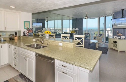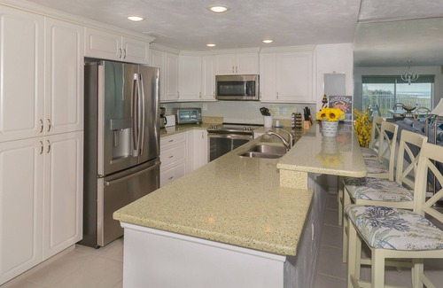 Take in the amazing oceanfront views from the spacious living room featuring a large section couch, and smart TV that connects to Netflix, VCR, and DVD player. The freshly updated, fully equipped kitchen features stainless steel appliances, granite countertops, and everything you'll need to prepare meals for the family. Enjoy meals with a view from the oceanfront dining room featuring seating for 6 with additional seating at the kitchen counter for 4.