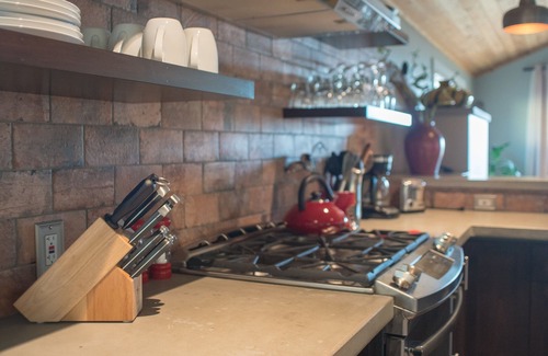 The gourmet dream kitchen is fully equipped for cooking and entertaining, the food lovers dream! The spacious kitchen opens into the living room and has a fantastic view of the bay. Living room features a large smart TV, french doors to the deck, a romantic gas fireplace and plenty of comfy seating to relax and take in the amazing view. The apartment has lots of windows, tall cedar ceilings and heated floors in the bathroom and kitchen.