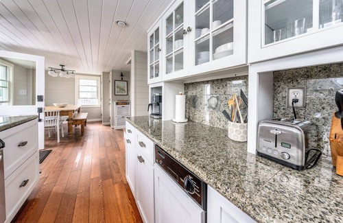 Full kitchen, dishwasher, dining area with a generous farmhouse table, seats 8, an ideal spot to spread out for remote work. Pack as if you were going to be on a yacht as the home is nearly 100 years old, limited storage but the hidden washer and dryer make packing light a breeze!
