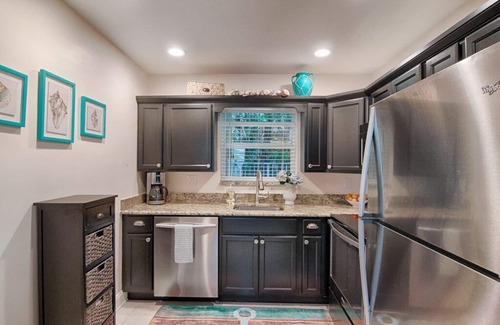 The cozy yet well appointed kitchen is stocked with just the right amount of pots, pans, dishes, bake ware, cutlery, cooking utensils, wine glasses and more. A 10 cup coffee maker with filters, a 2 slice toaster and a Cuisinart blender are some of the small appliances available for use. We provide basic starter items for all guests; new sponge, 2-3 rolls of paper towels, 2-4 rolls of toilet paper, garbage bags, dish soap, hand soap, basic spices and more.