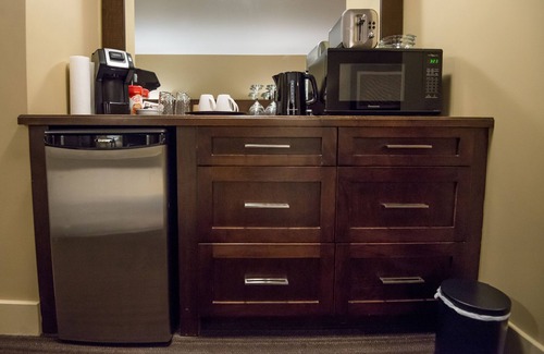 * Small kitchenette ("Continental Breakfast-style") with a microwave, small bar fridge, kettle, and a Keurig coffee pot. There is no stove, cook plate or sink.