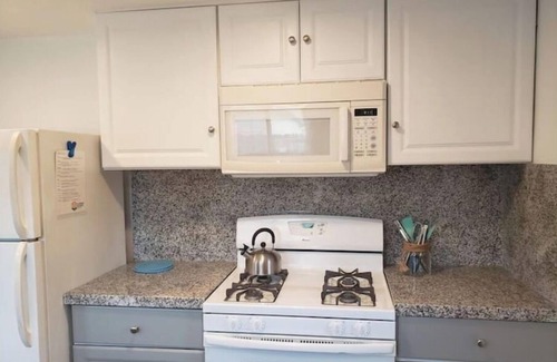 Close to beach, plenty of parking. Front porch lovely for morning coffee with a glimpse of the ocean. Porch has table seating for 4 and a bench. Propane BBQ.