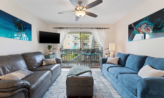 Enjoy your patio view of the Gulf of Mexico and relax steps away from the beach, pool and duck ponds with fountains. FREE wi-fi, full kitchen, washer/dryer, flat screens. King bed in primary BR, 2 double beds in guest, plus pull-out sofa couch and queen air mattress. It is fully equipped with pots/pans, dishes, glasses, utensils, etc. The breakfast bar seats 2 with a casual dining table for 4.