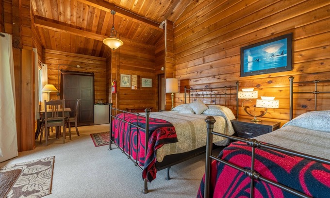Ocean View Lodge with two double beds, deck, ocean view. Hot breakfast included. | Bed & Breakfast in Alert Bay