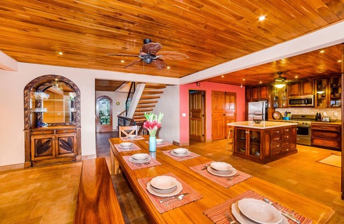 Facing the blue waters of the Pacific Ocean, and filled with tropical breezes from every room you will have no trouble relaxing and enjoying your time at Casa Loca. 360 degrees of breathtaking views surround this expansive house. Wake up to the sunrise over the mountains as you watch a hummingbird find his breakfast from the tropical and extensive landscaping. By mid day you may want to take a dip in the large ocean front pool or just relax in a hammock with a good book. With three floors, a large covered first floor outdoor pool area, a second floor wraparound porch and a third story ocean look out you can always find a perfect spot to enjoy the beauty that surrounds Casa Loca. Walk a short distance in our gated community to Playa Negra, Sandy Beach, and more for surfing, beach combing, dining, sunset drinks, and rejuvenating ocean views. Casa Loca also features a 24 hour private guard service that is shared with 9 other homes in the same community.