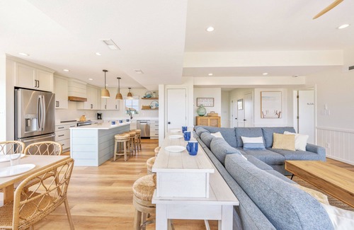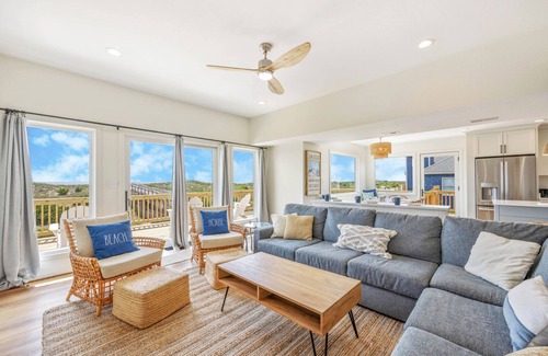 OCEANFRONT Waves - Sea Vista Drive - NEWLY RENOVATED INTERIOR FOR 2024! This oceanfront retreat, located in the premier St. Waves Community, is the ultimate home for families with 4 master suites and two dormitory style rooms, each with a double and two twin beds, for kids or teens with shared full bath. All bedrooms have new large Smart TVs. All 4 master bedrooms have deck access to the pool and ocean. Start your vacation with an unforgettable sunrise from the upper oceanfront decks or an easy stroll to the wide sandy beach via a boardwalk beside the property. Spend afternoons by the private pool (heat optional), in a sun chaise or in the new shaded deck area just outside the new media room with 70” Smart TV. The kitchen has plenty of room for the family chef, and dinners can be served with ocean vistas in the nearby dining area inside or outside on the oceanfront deck. The large great room ensures relaxing evenings with room to lounge together on the new sectional for game night or to watch a movie on the 75” Smart TV.