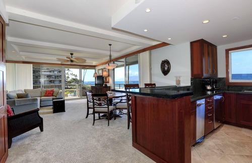 The oceanfront corner unit provides unobstructed expansive views which include the neighboring islands of Lanai and Molokai and the sandy Kaanapali Beach all the way to Black Rock which is known for superb snorkeling and cliff diving.