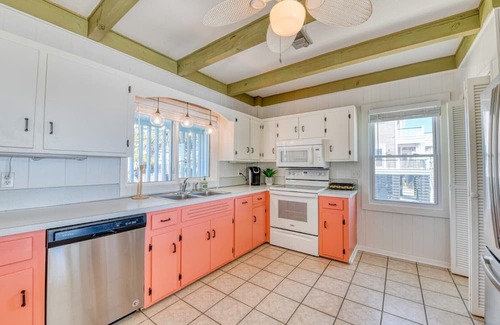 Conch Baby is a four-bedroom, three-bath oceanfront home, located 2.7 miles south of Garden City Pier. This property features a fully-equipped kitchen complete with a microwave and dishwasher, as well as a washer, dryer, central heat and air conditioning, and ceiling fans throughout. Five TVs (Smart with Roku in living room) and Wi-Fi are also provided. Sleeping accommodations include three queen-sized beds and two twin-over-double bunk beds. One bedroom is located at ground level and has a bathroom with a shower only, plus a wall unit air conditioner. Outdoor amenities include a sundeck. No interior stairway. Permit trailers. Permits motorcycles. No pets. No smoking. Maximum occupancy: 10