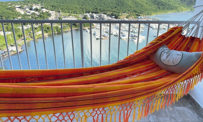 ★✮ Private Large Balcony ★✮ Offers stunning views of the ocean and nearby islands, creating the perfect setting for relaxation. It features outdoor furniture, including a eucalyptus table with four modern chairs and a comfortable bench that can accommodate 6 guests. Space is adorned with nautical-themed decorations. A handmade hammock invites you to unwind, allowing you to listen to the soothing sounds of crashing waves and boats coming in and out of the marina. This outdoor space is ideal for enjoying your morning coffee or evening sunsets while basking in the coastal breeze.