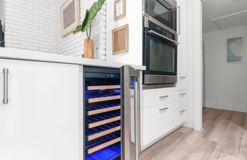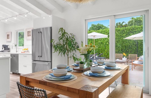 Set the stage for a special occasion dinner or enjoy a casual take-out meal from the abundance of local restaurants. The fully equipped, and well stocked chef’s kitchen, with island bar seating, boasts a built-in wine cooler, a flat top stove, wall oven and microwave, and a French door refrigerator. The dining table seats 6, with a pool and garden view.