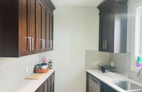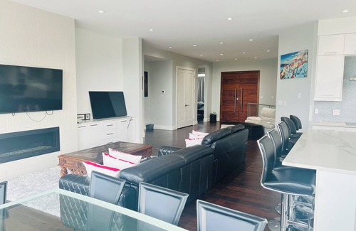 Property is high end new house having ocean view fromall rooms and three. Large decks water and natural gas connection on each deck Weber bbq. 4 led smart tvs two fast wifi Telus fibre optic. I Mac computer for guests two car garage 5-8 car parking outside electric plugs for charging large fridge freezer one unit wall mounted microwave and oven one unit gas and electric stove two dishwasher mile and kitchen aid spice kitchen hs own sink stove and oven High end linear fire place tree luxury couches for 9 people sitting moden glass dining table with 8 chairs outside dining table on deck ocean view patio furniture beautiful land scaping indoor and outdoor plants engendered hard wood floor heated floor tiles in bathrooms Four standing shower and two bath tubs central air conditioner and forced hot air laundry on top floor walk in closets central vacuum two king size and three queen size luxury beds comfy mattress one sofa bed in living area granite counter tops seamless glass railing on roof deck painting art work in most areas All amenities like rice cooker pans coffee machine crockery wine glasses. Amazing ocean views from every corner or every bed room. Roof deck exclusive features tv smart. Parking for more than five cars access to park walking distance trails two minutes drive to neck point and pipers lagoon beaches 5 mnts walk to pub and liquor store. 10 mnts drive to downtown and golf course 5 mnts drive to island biggest shopping mall Woodgrove center. Cruise ships can be seen from decks Very quite and peaceful area. Three floors pets allowed remote controlled blinds house on top of street so totally private. Instant hot water tank smoke alarms engendered stone wall at front main door and patio door 8 feet opening. Wheelchair accessible