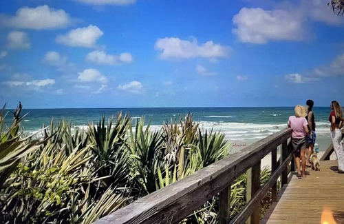 Bedrooms are Master King bed and secondary has a new queen bed and new twin bed. Also includes a queen blowup.Oceanwalk Condominiums are situated at the quiet end of NSB. Smaller dogs only and add pet fee at booking. Ask if more than 1 dog fee is per dog. This unit offers all the amenities of home! The almost 1400 sq foot oasis faces the ocean, so you get a peek of the ocean from the large balcony off the living room and can also view the ocean from the main bedroom. Bedroom includes access to the patio as well. Unwind on the balcony with your favorite glass of wine or beverage. This 2nd floor corner unit is situated in the front of the community and offers a nicely furnished large living area with a spacious kitchen, a full laundry room, large main bedroom with a luxurious attached bathroom which includes a jetted tub separate from the standup shower. There is also a large front bedroom with 1 queen and 1 twin plus an area with a desk for office work (private video conf. calls) or school usage. Second bathroom is situated right next to this bedroom-full bathroom with tub/shower etc. Brand new Smart TV's in all the rooms with high speed internet hooked up for streaming your favorite channels/shows, or for getting any left-over work completed. This condo rental includes secured covered garage parking for 1 car along with pool passes-2 resort pools, rec. center, sauna, and gym access (includes tennis courts, shuffle board, & basketball.) Steps to pool and resort right outside unit’s front door off sundeck. It’s a short walk to the beach along the sidewalk with a dedicated beach boardwalk across the street. There is also a beautiful nature path along the entire community to view the nature preserve that runs along the back of the community. If renting during rocket launch schedules-incredible views of the launches from the balcony. Canaveral Seashore only a few minutes away. Community is only a short 5-minute drive to Flagler Avenue to enjoy all the extensive shops, bars, and restaurants that New Smyrna Beach offers. Beach gear available as well. Just bring your favorite food and drink, kick back and relax.