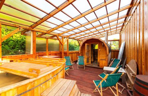BathroomGuest bathroom, Shampoo, Hairdryer, Free toiletries, Body soap, Shared toilet, Bathtub or shower, Toilet paper, Toilet, Towels, ShowerMedia & TechnologyTV, Flat-screen TV, RadioActivitiesHot tub, SaunaGeneralPrivate entrance, Iron, Trash cans, Heating, Ironing facilities, Fire extinguisher, Tile/Marble floor, Hardwood or parquet floorsOutdoorsTerrace, Patio, Barbecue, Balcony, Outdoor furniture, Outdoor dining areaKitchenStovetop, Oven, Dishwasher, Kitchen, Coffee machine, Toaster, Wine glasses, Refrigerator, Cleaning products, Dining table, Electric kettle, KitchenwareLiving AreaSofa, Sitting area, Fireplace, Dining areaBedroomLinens, Childrens' cribs, Extra long beds (> 6.5 ft)ViewGarden viewBuilding CharacteristicsDetachedRoom AmenitiesDrying rack for clothing, Clothes rack, Hypoallergenic pillow, Socket near the bed, Sofa bedEntertainment & Family ServicesBoard games/puzzles |