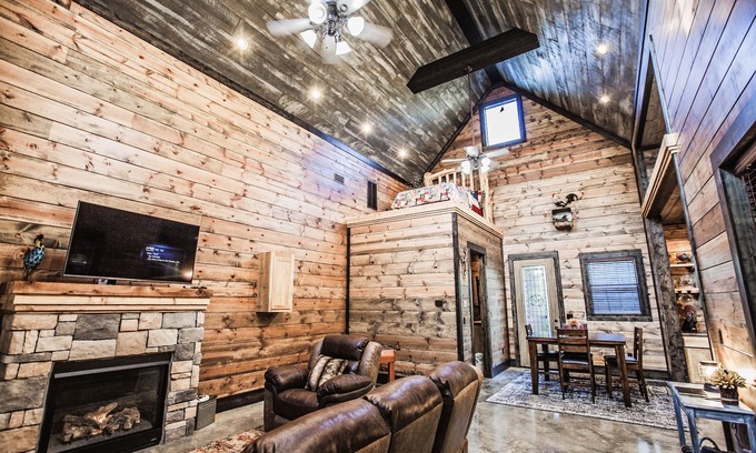 Couples Luxury Cabin | 1 Master Bedroom | Sleeps 4 | Rich Woods | Farmhouse Upscale Design | Secluded | Pet Friendly | Covered Porch | Real Woodburning Fireplace, Outdoor Furniture | Outdoor TV