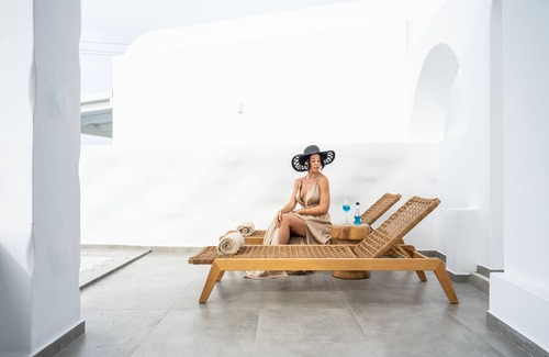 Outside there are a private yard and a balcony, overlooking the Aegean Sea and the most famous sunset, with a dining area for 10 persons, to enjoy alfresco dining. Also, there is a private outdoor heated hydro massage spa (for 5 persons) and a common use swimming pool, which combined with the perfect sea view, will keep you there the whole day. The luxury combined with the ultimate privacy offers an unforgettable stay and a unique experience.