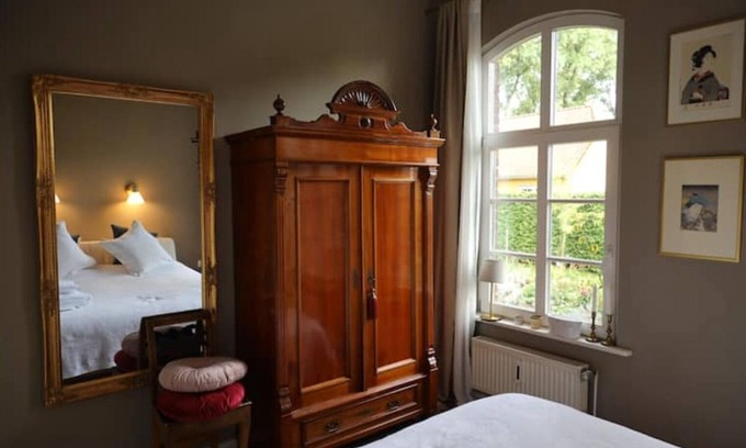 Tasteful holiday flat in an old schoolhouse from 1875 in the Lüneburg Heath. The flat has a handicapped-accessible, newly renovated bathroom with underfloor heating, a metal-free Kingsiz bed from the Team7 manufacture with high-quality Tempur Cloud mattresses for a particularly restful night's sleep, open-plan living/kitchen area in the old half-timbered building with large panoramic window, mix of antique elements and designer furniture.