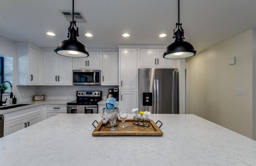 Relax inside with this beautifully remodeled four bedroom three full bathroom house with private pool! There are 7 large screen TV in this house including 65" entertainment system in Family Room. The family room, kitchen and dining room are large and open for a great entertaining space. Home also has custom Game room with Pool Table and Separate Bar Area, tons of fun!! The backyard also features a large swimming pool, outdoor dining table, fire pit, BBQ, Jacuzzi, corn hole game, and of course large screen TV!