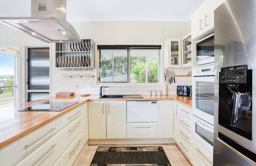 Upon arrival, guests are greeted by a charming timber deck and dual door entry leading to the expansive open-plan kitchen, living, and dining space. The kitchen showcases upgraded appliances and generous storage, while the living area is enhanced by a welcoming wood heater. Step onto the rear deck to unwind amidst stunning vistas of the seven sisters and Lake Tinaroo.