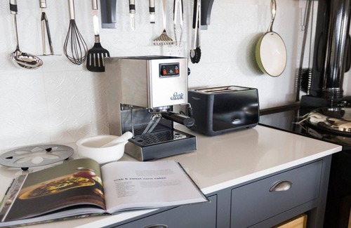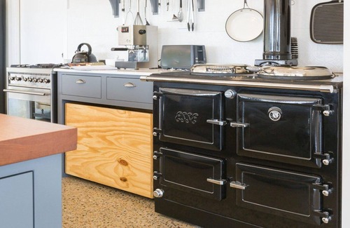 The kitchen cast iron wood-fired boiler and cooker is supplemented by a gas oven and cooktop for use in warmer months.