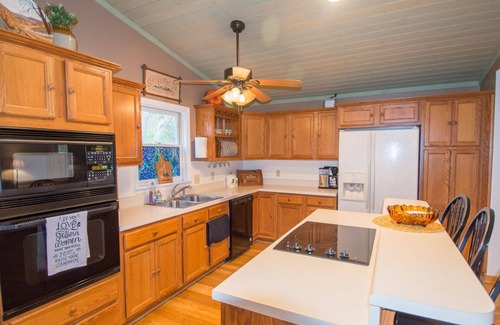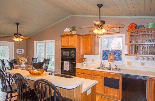 The kitchen has plenty of counter space, plus island bar seating for three people. You'll find everything you need in this vaulted room plus including a dining table for 6 with a view of the river.