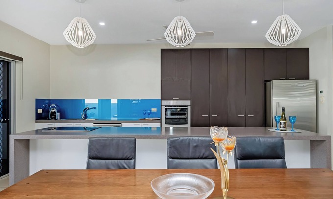 Your residence features a full length, undercover patio including a large dining setting with views over the beautiful inground swimming pool. At one end you will find an open-air shower so you can swim and shower before relaxing around the pool. The entire home has beautiful tropical gardens all around. The home features tiles throughout, with ceiling fans and air conditioning for when you need to cool off and cosy up for movies. The main living, dining and kitchen all overlook the pool area with glass sliding doors for easy access to outdoor dining and pool. The second living area features sliding doors and a second television, so if you bring the children they have their own secure entertainment space. There are also games and books provided, along with a small children’s table.