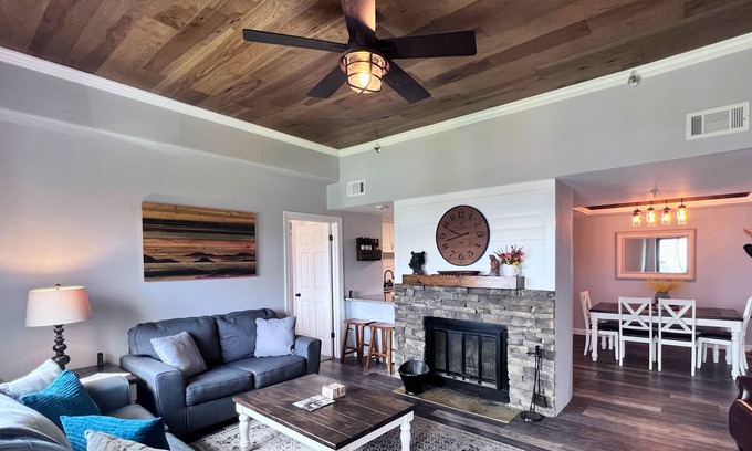 The owners have spared no expense in making this mountain modern condo one that will afford you all the comforts of home. Each room is tastefully decorated and has its on ceiling fan and flat screen TV, hardwood floors through-out. Master bedroom has a king bed and the second bedroom has a queen bed. There is also a sleeper sofa available in the living area. Updated kitchen is bright and roomy with all stainless steel appliances.