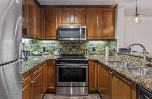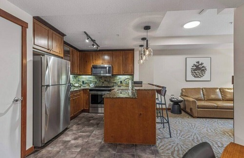 This newly updated suite provides everything that you need for vacation. With fully stocked kitchen you can cook & enjoy all your meals. The living room has pull-out couch, a fireplace & pool/mountain views from patio. Unit has King size bedroom with patio access, full bath & in-suite laundry. Amenities include year round heated outdoor pool, 2 outdoor hot tubs, fitness room, on-site spa treatment rooms, on-site EV chargers, underground parking with self car wash, & outdoor bbq area/courtyard.