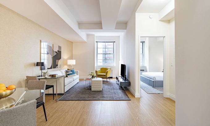 This spacious one bedroom apartment is in an art deco style building close to the Financial District and Battery Park in downtown Manhattan. It offers light-filled rooms and modern amenities. The apartment features oversized windows, hardwood floors, and high ceilings, as well as a fully equipped kitchen with granite countertops and stainless steel appliances. All beds provided are fitted with plush linen sheets and pillows. All Furnished Quarters apartments include 24/7 guest service.