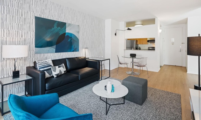 This apartment is professionally managed by Furnished Quarters, the largest independently owned and operated supplier of short-term furnished housing with over 25 years of experience in the industry. This luxury high-rise apartment building is pet-friendly and offers amenities like a 24-hour concierge, community lounge, 24-hour tri-level fitness center, on-site laundry and more. Visit attractions such as Times Square, Radio City Music Hall and Rockefeller Center.